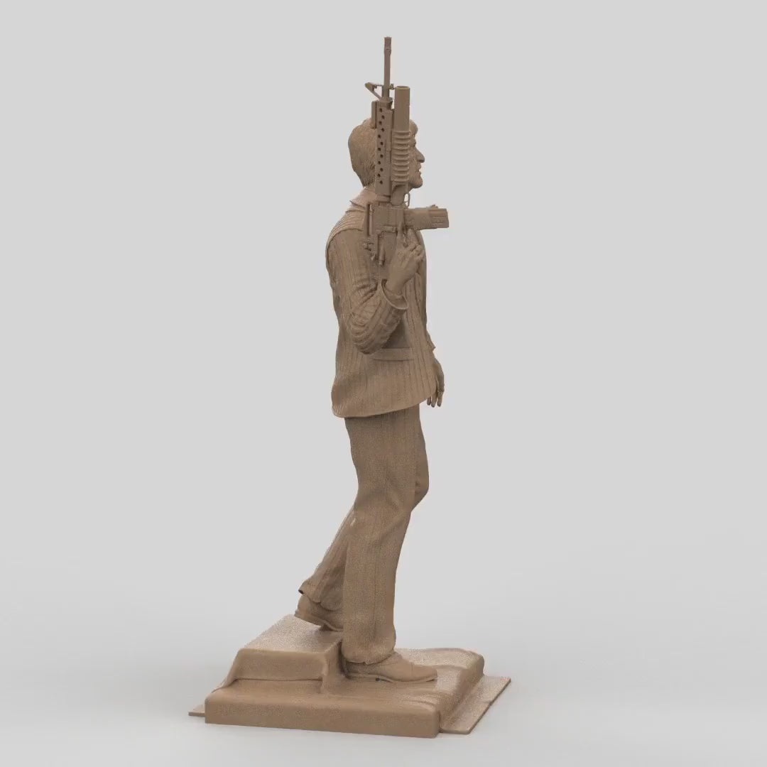 3D-printed statue inspired by Scarface, depicting a suited man in a confident pose, holding an assault rifle over his shoulder. The figure wears a detailed pinstripe suit and stands atop a textured base, capturing a bold and iconic cinematic moment with lifelike facial expression and dynamic stance.