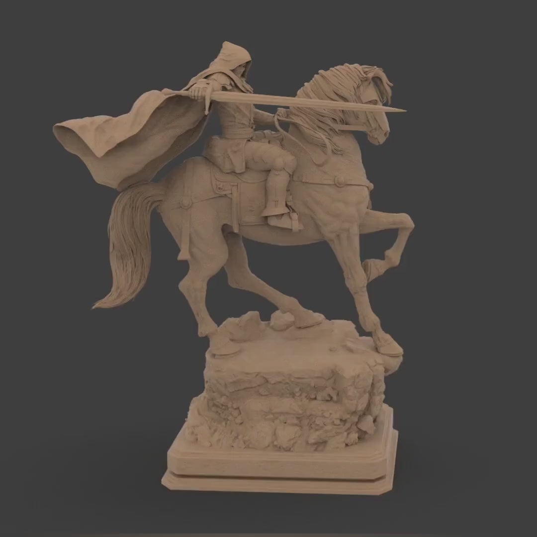 Command attention with this imposing mounted figure, a dark sovereign sculpted in full stride atop his steed. With sword raised and cloak billowing, this figurine captures the perfect fusion of dominance, grace, and raw authority.